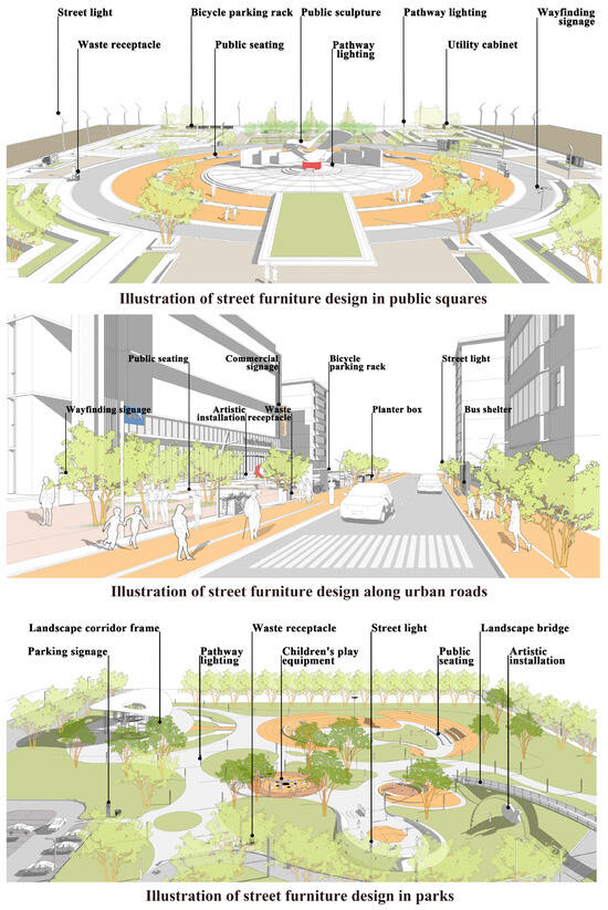 Second, targeted design and arrangement strategies were proposed according to the functional characteristics of different scenarios. Based on on-site surveys and behavioral observations, the study first identified the main activity types and crowd-gathering nodes in typical urban spaces, such as squares, roads, and parks. It then determined priority areas for furniture placement through analyses of the visual corridors, accessibility, and surrounding functional facilities. Finally, furniture types were selected and combined according to the behavioral characteristics of each scenario to enhance the practical effectiveness of the installations. For example, in square scenarios, composite furniture, integrating rest, gathering, and cultural display functions, was arranged along crowd circulation routes and activity cores. In road spaces, seating, information guidance, and shelter facilities were placed at bus stops, major intersections, and pedestrian nodes. In parks, interactive, ecological, and recreational furniture was integrated within activity-intensive zones and landscape nodes (Figure 5).