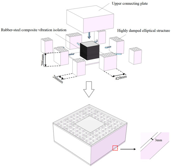 In order to give full play to the mechanical advantages of elliptical negative Poisson’s ratio structures, a block structure design scheme is adopted in this study. This design divides the elliptical negative Poisson’s ratio high damping rubber material into multiple independent modules, which effectively activate the lateral contraction effect of the negative Poisson’s ratio structure while ensuring that the vertical stiffness of the isolation bearing meets the requirements of the building code [30]. When the structure is subjected to external loads, the block structure can deform cooperatively, so that the characteristics of the negative Poisson’s ratio can be fully reflected, and then the energy dissipation capacity of the isolation bearings can be greatly improved.