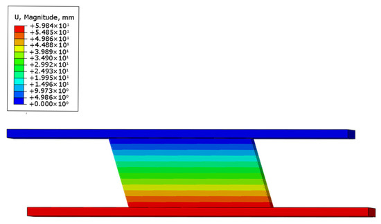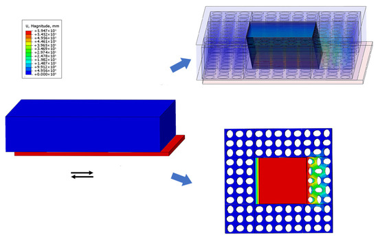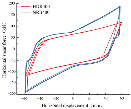 In order to verify the rationality of the finite element analysis and the correctness of the modeling method in this paper, a horizontal displacement amplitude simulation analysis of two kinds of rubber bearings (the HDR400 is a high damping rubber bearing, and the NRB400 is a negative Poisson’s ratio structural isolation bearing) is carried out. The length to width ratio of the NRB400’s elliptical holes is 1.2, and the number is 14 × 14. The finite element simulation results are compared and analyzed. In terms of material constitution, the rubber material uses the Mooney–Rivlin model, and the constitutive parameters of steel are Young’s modulus of 210,000 Pa and Poisson’s ratio of 0.27. In the specific operation, the steel plate surface is defined as the master surface, and the rubber surface is defined as the slave surface. Through this master–slave binding mechanism, it is ensured that there will be no relative slip between the rubber and the steel plate during the stress process, which truly restores the cooperative deformation behavior in a real situation.
