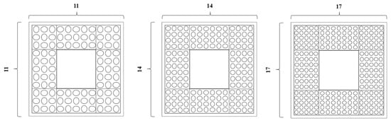 In order to better study the influence of the elliptical negative Poisson’s ratio structure on the isolation bearing, this section studies and analyzes the number of holes in the elliptical negative Poisson’s ratio structure, considers the uncertainty of an earthquake in the horizontal direction, respectively establishes the elliptical structure with the number of holes of 11 × 11, 14 × 14 and 17 × 17 as the filling structure, as shown in Figure 8, applies a displacement amplitude of 60 mm in the directions of 0°, 30° and 45°, and analyzes its mechanical properties through comparative analysis.