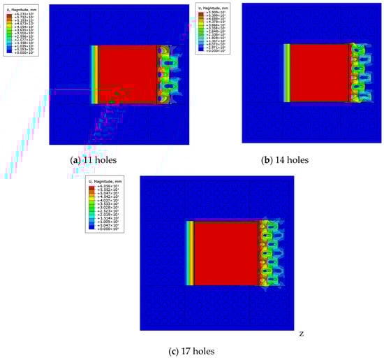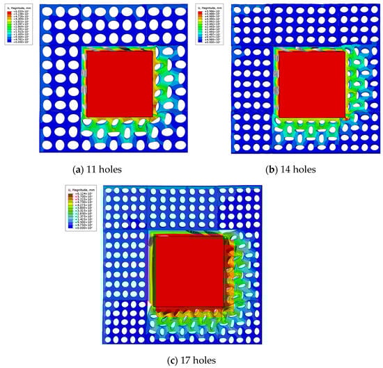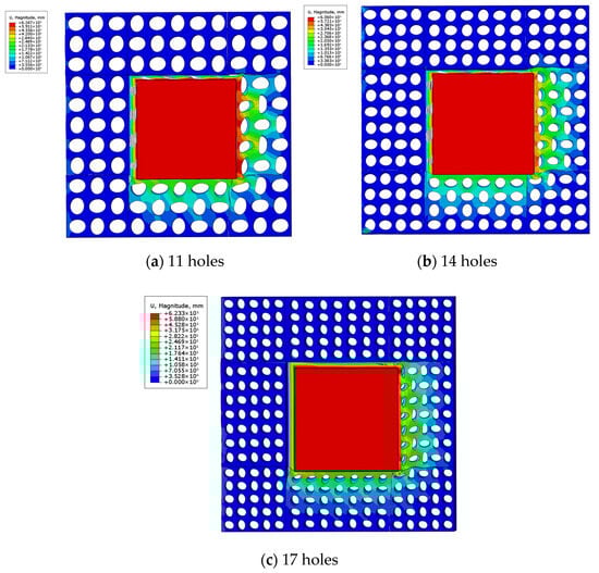 It can be seen from Figure 9 that when the NRB structure is compressed in the 0° direction, only the elliptical negative Poisson’s ratio structural blocks in the horizontal direction are compressed, and all of them shrink inward. However, with the increase in the number of apertures, the deformation of the 17 × 17 structure is more prone to the phenomenon of hole compression and compaction. This phenomenon may be due to the fact that the distribution of apertures makes the internal force transmission path of the structure more dispersed, and the mutual constraint between adjacent elliptical structural blocks is enhanced.