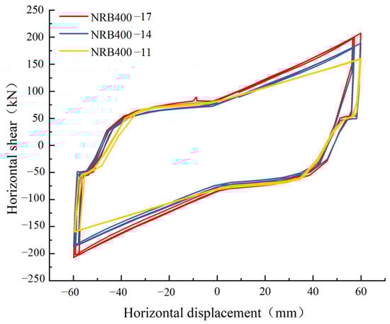 By comparing the amplitude curves of the traditional NRB high damping elliptical rubber bearings with the innovative NRB high damping elliptical rubber bearings with negative Poisson’s ratio (Table 1), the research results show significant performance differences. Under the same 60 mm displacement amplitude loading condition, the isolation bearing with elliptical negative Poisson’s ratio structure shows excellent mechanical performance improvement, and the peak shear force it can withstand reaches 188.78 kN, which is 65% higher than the 114.41 kN of the traditional HDR bearing. These data show that the introduction of the negative Poisson’s ratio structure not only does not weaken the original vertical stiffness characteristics of the isolation bearing, but also significantly enhances its horizontal bearing and energy dissipation capacity by optimizing the structural deformation mode.
