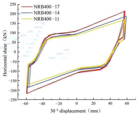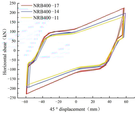 As shown in the results (Figure 14 and Table 4), under the conditions of 45° direction and 60 mm displacement, the average shear force and maximum shear force of elliptical negative Poisson’s ratio structural isolation bearings NRB400-11, NRB400-14 and NRB400-17 increase with the aperture increasing from 11 mm to 17 mm, reflecting that the large-aperture bearing has stronger shear resistance and extreme bearing capacity in this direction. At the same time, compared with the 0° and 30° directions, the average shear force and the maximum shear force of each type of bearing in the 45° direction are greater, reflecting that the angle change significantly affects the bearing mechanical performance, and the effect of increasing the aperture on the improvement of bearing shear performance has a marginal decreasing trend.