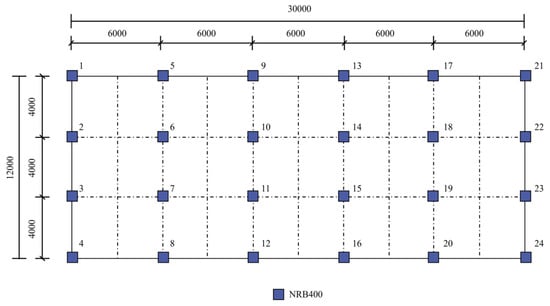 The elliptical negative Poisson’s ratio structural isolation bearing is selected as the isolation system, and its mechanical model refers to the theoretical system constructed in the previous content to ensure the consistency and accuracy of mechanical parameters in the analysis process. In the actual modeling application, the seismic isolation bearings are led into the bottom of the frame column in a 5 × 6 matrix arrangement to bind, and a complete seismic isolation structure and the original structure model are constructed (Figure 15).