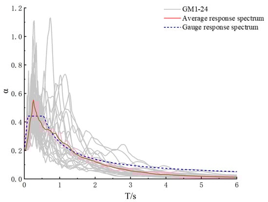 This study comprehensively referred to the requirements of the peer ground motion database [34] and the relevant provisions of the seismic code, and finally determined to select 24 groups of near-fault pulse-type seismic actions as the analysis input, as shown in Figure 17.