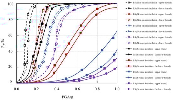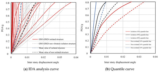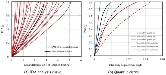 IDA analysis is used for the isolated structure. The equivalent shear strain γ of the isolated bearing is selected as the damage index, and PGA is used as the seismic input strength index. Finally, the IDA analysis curve and quantile curve of the isolated bearing are obtained, as shown in Figure 20a. It is found that the equivalent shear strain γ of the isolation bearing increases gradually with the increase in the PGA strength of the input ground motion. For the isolated structure, under the fixed PGA input, there is a significant difference in the equivalent shear strain γ of the isolated bearing, which is due to the uncertainty of the ground motion input, resulting in different responses of the structure under different ground motion excitations.