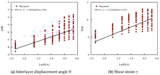 According to Equation (4), to obtain the seismic vulnerability curve, it is necessary to perform regression analysis on the results of incremental dynamic analysis, and then determine the seismic probability demand parameters. The research takes the logarithm of the peak ground acceleration PGA as the abscissa and the logarithm of the maximum story displacement angle between the reinforced concrete frame structure and non-structural members and the equivalent shear deformation of the isolation bearing as the ordinate to carry out the linear fitting operation. The specific results are shown in Figure 21, and the corresponding seismic probability demand parameters are shown in Table 10.