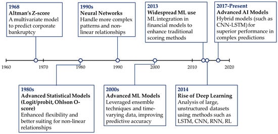 Evolution of predictive models in financial bankruptcy prediction (ML—Machine Learning; CNN—Convolutional Neural Networks; LSTM—Long Short-Term Memory; RNN—Recurrent Neural Network; RL—Reinforcement Learning).