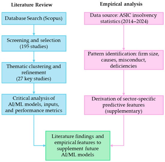 This study employs a dual-method research strategy (see Figure 2) comprising a structured and thematically refined literature review on predictive insolvency modelling in construction and an empirical analysis of Australian construction insolvency data to derive sector-specific features that can inform future model development.