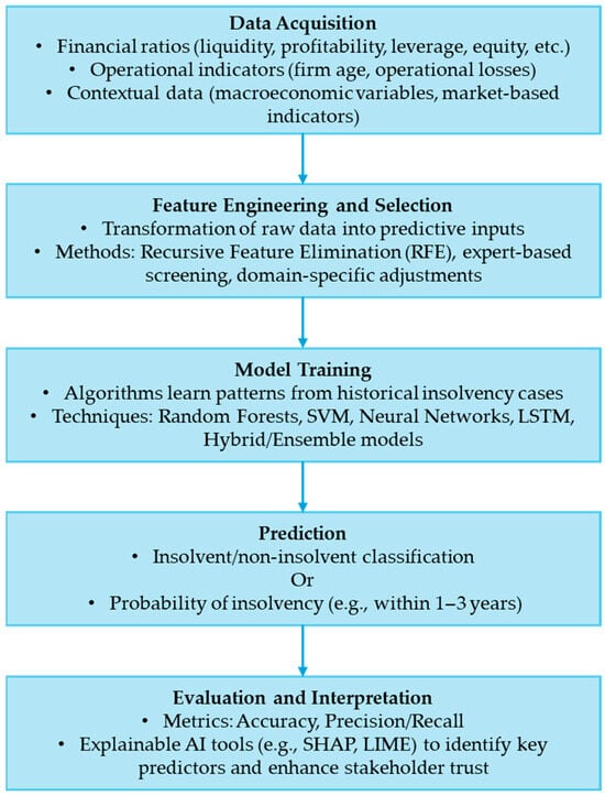 A focused analysis of the AI/ML-driven studies (see Table 2) reveals the rapidly expanding role of AI and ML in the prediction of bankruptcy and financial distress within the construction industry. These models predict insolvency by processing financial, operational, and contextual data through algorithms capable of identifying complex, non-linear patterns linked to business failure. In this review, each study is examined in terms of its data inputs, feature selection process, modelling technique, and evaluation metrics, enabling a clear understanding of the predictive process. To further clarify how AI operates in this context, Figure 3 illustrates a typical AI/ML workflow for insolvency prediction, beginning with data acquisition, followed by feature engineering and model training, and leading to prediction and evaluation using performance metrics and XAI tools. This diagram provides a concise visual summary of the process, complementing the detailed discussion presented in this section.