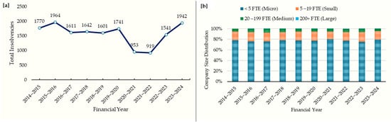 (a) Total insolvency in the Australian construction sector reported by ASIC []; (b) company size distribution (measured by full-time equivalent employees) of the insolvency cases.