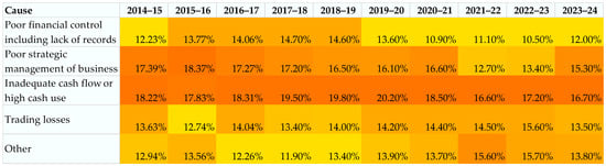 Analysis of the leading causes of construction insolvency from 2014 to 2024 highlights a persistent set of internal, operational risk factors (Figure 5). Throughout the decade, inadequate cash flow or high cash use consistently ranked as the most common cause, accounting for approximately 16% to 20% of cases each year (peaking at 20.2% in 2019–2020). Poor strategic management was the next most cited cause, representing 13% to 18% of insolvencies annually, while poor financial control, including lack of records, was present in 11% to 15% of cases. Trading losses remained a significant contributor, comprising roughly 13% to 15% of insolvencies each year. These figures demonstrate that financial mismanagement, weak strategic direction, and recurring cash flow issues have remained the predominant drivers of failure in the sector, with their relative importance showing only modest fluctuation over the observed period.