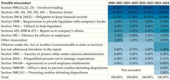Possible misconduct in the insolvency cases (The categories of possible misconduct presented in this figure are defined under various sections of the Australian Corporations Act 2001).