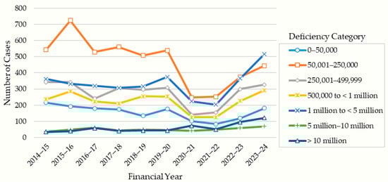 A detailed examination of net deficiency (see Figure 7), the gap between liabilities and assets at the point of insolvency, reveals the considerable scale of financial distress among failed construction firms. Over the decade, most insolvencies occurred in the lower to mid-deficiency brackets. For example, in 2023–2024, 444 companies (nearly 23% of cases) had deficiencies between $50,001 and $250,000, while 327 firms (around 17%) were in the $250,001 to $499,999 range. Notably, a substantial portion of companies each year exhibited even larger shortfalls as seen by 517 cases (26.5%) in 2023–2024, involving deficiencies between $1 million and $5 million, and the number of firms with a deficiency exceeding $10 million has grown steadily, reaching 122 in the latest year, an all-time high for the decade. While the smallest bracket (<$50,000) accounted for only 9% of cases in 2023–2024, higher-value brackets have generally seen increasing counts since 2020. This pattern highlights that insolvency in the sector is often preceded by the accumulation of significant financial shortfalls. These trends emphasise the importance of continuous monitoring and early intervention based on changes in net deficiency as a leading indicator of severe financial stress.