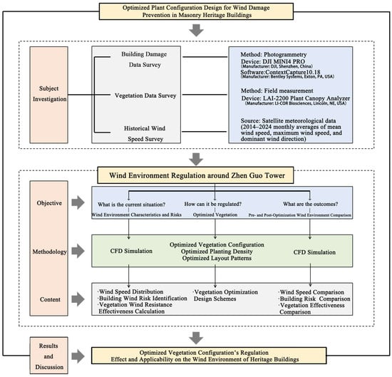 Unlike previous studies that focus on structural reinforcement or stress response modeling, this study emphasizes a preventive conservation approach—reducing aerodynamic loads through vegetation optimization to mitigate wind-induced deterioration. This study seeks to address the following three core research questions: (1) To what extent does the existing vegetation configuration around Zhen Guo Tower regulate the local wind environment? (2) Can vegetation communities significantly reduce wind-induced risks during extreme weather conditions? (3) Can the optimization of the vegetation layout effectively enhance the wind protection performance, thereby providing a replicable ecological strategy for the conservation of masonry heritage buildings?