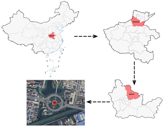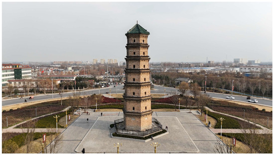 Weihui is a county-level city in northern Henan Province, China, between a 113°51′–114°19′ E longitude and a 35°19′–35°42′ N latitude. The region is characterized by a warm temperate continental monsoon climate (Figure 2). Zhen Guo Tower, also known as Lingying Tower, is located in a roundabout park along Jianshe Road in the urban area of Weihui. Originally constructed in 1585 AD during the 13th year of the Ming Dynasty’s Wanli reign, the tower is a representative seven-story pavilion-style brick pagoda. It stands at 34.5 m tall with a hexagonal base, featuring densely arranged eaves and intricate dougong brackets, reflecting the advanced masonry techniques and architectural esthetics of the Ming Dynasty (Figure 3). In 1986, the tower was designated as a provincially protected cultural heritage structure in Henan. Despite multiple restorations, the tower has retained its overall historical integrity and original appearance.