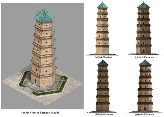 For the assessment of structural deterioration, the three-dimensional reconstruction was performed using Bentley ContextCapture 10.18. A total of 452 high-resolution images captured by a DJI Mini 4 Pro UAV were processed through four main steps: (1) an automatic camera calibration and distortion correction, (2) the extraction and matching of key points to generate a sparse point cloud, (3) the construction of a dense point cloud and triangular mesh, and (4) a volumetric reconstruction with texture mapping. The resulting model achieved an average ground resolution of approximately 6 mm/pixel and a mean reprojection error of 0.67 pixels, ensuring a sufficient accuracy to detect surface defects on the heritage tower (Figure 4). This model enabled the identification, measurement, and statistical analysis of the material loss, cracking, and surface degradation. The investigation revealed a high concentration of structural defects, particularly on the north and northeast façades of the tower (Table 1). According to the 2019 ICOMOS report on climate change and its impact on heritage structures [26], the primary wind-related deterioration types observed on the Zhen Guo Tower include the following: