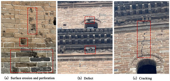 As a significant typology of traditional Chinese architecture, masonry buildings constitute an essential component of China’s architectural heritage [5]. Owing to their high structural rigidity, low tensile strength, and frequent exposure to open-air in situ conditions, masonry heritage structures are particularly vulnerable to deterioration. Prolonged exposure to climatic factors, such as wind, solar radiation, rainfall, and moisture evaporation, often leads to significant material degradation over time [6].