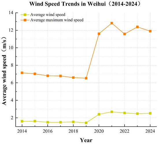 According to wind speed monitoring data from the Weihui Meteorological Station spanning from 2014 to 2024 (Figure 6), the region exhibits an average annual wind speed of approximately 2.0 m/s. Between 2014 and 2019, the maximum recorded wind speed remained relatively stable at approximately 7.0 m/s. However, a notable increase has been observed since 2020, with a peak value reaching 12.8 m/s in 2021.