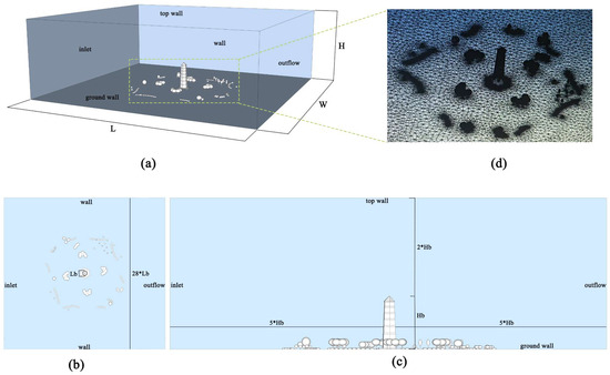 Computational domain and mesh details: (a) computational domain; (b) top view; (c) side view; and (d) computational grids.