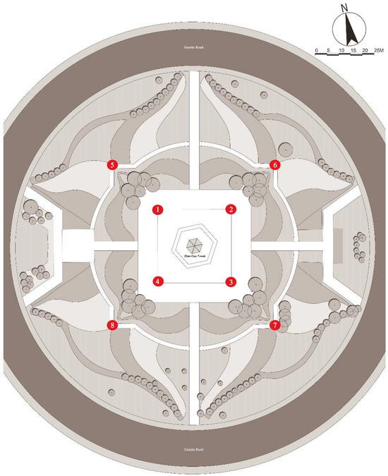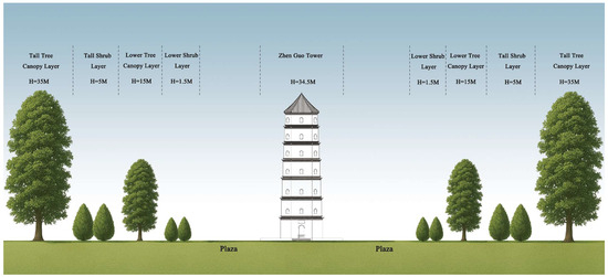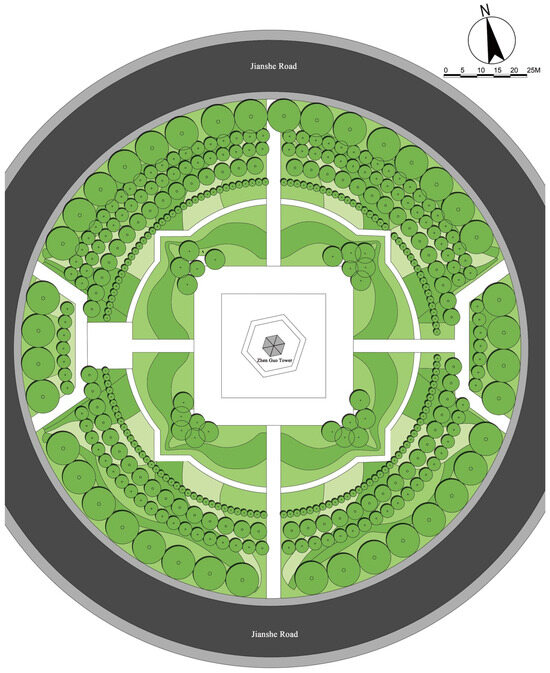 Zhen Guo Tower is surrounded by a 48 m wide paved plaza, which is encircled by an approximately 50 m wide ring-shaped greenbelt. Based on on-site vegetation surveys and spatial measurements, the primary plant species distribution (Figure 8) and configuration details (Table 2) are summarized as follows.