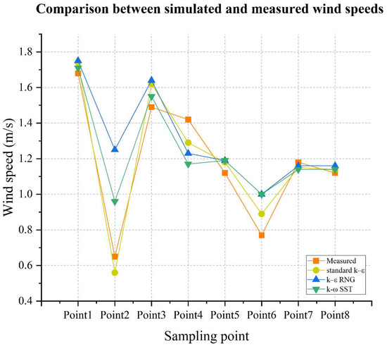 To further evaluate the robustness and reliability of the CFD simulation results, a sensitivity analysis was conducted using three commonly adopted turbulence models: Standard k–ε, RNG k–ε, and k–ω SST. Under identical boundary conditions, wind speeds at eight sampling points (1.5 m height, as shown in Figure 10) were simulated and compared with measured field data.
