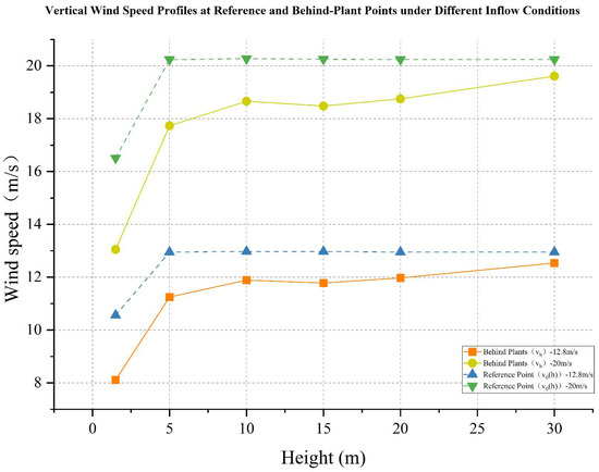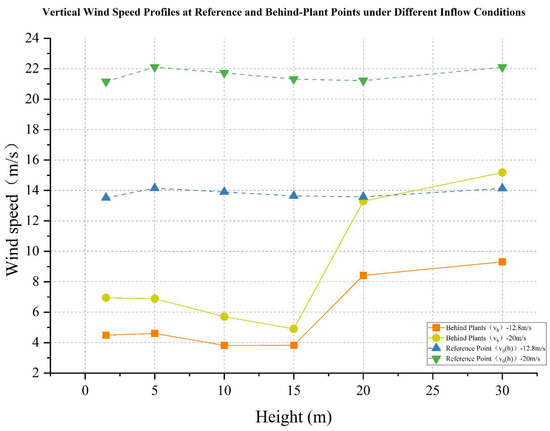 Vertical wind speed profiles at reference and behind-plant points under different wind conditions in the optimized vegetation layout.