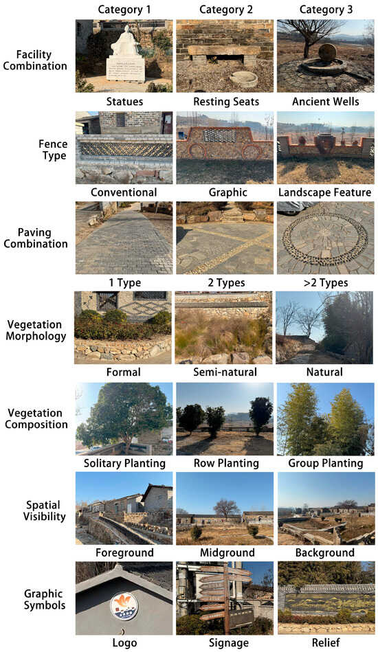 Based on the characteristics of rural landscapes and EEG experimental requirements, this study established a three-level observation system comprising 10 dimensions, as Table 1 and Figure 2. The “Material Element Layer” includes built structures (A1), architectural form (A2), paving materials (A3), and vegetation composition (A4); the “Spatial Perception Layer” covers spatial scale (B1) and visual corridors (B2); while the “Cultural Cognition Layer” involves colour (C1), symbolism (C2), and archetypes (C3). A total of 20 observation indicators were selected, such as “texture of building facades”, “patterns of paving combinations”, and “hierarchy of plant arrangements” [31].
