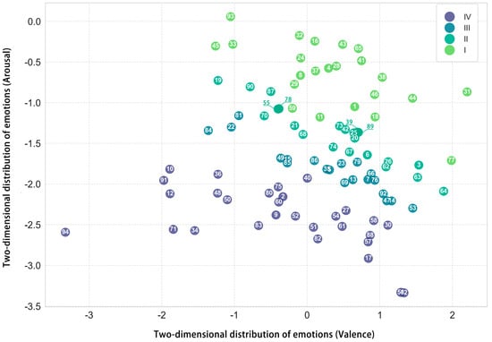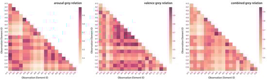 Due to different dimensions of arousal and valence indicators, normalization methods were employed for data standardization. This step enables a comparison of indicators with different dimensions under the same criteria, effectively preventing extreme indicators from excessively influencing the analysis results. Grey relational analysis enhances the ability to identify subtle differences by introducing the distinguishing coefficient , effectively overcoming data noise interference (Equations (3) and (4)):