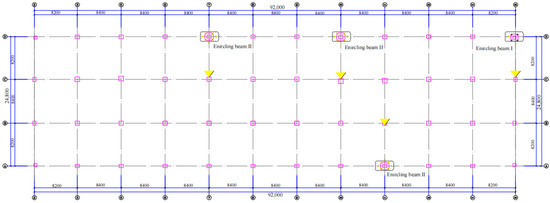 Under the entire replacement and reinforcement process of defective concrete columns, real-time stress and deformation monitoring of the main building and encircling beam are essential to ensure the safety of construction. Therefore, according to the construction plan and relevant specification [29], a monitoring program was conducted; this included the inclination and vertical settlement of the main building and the settlement of the replacement column. For the vertical settlement of the main building, observation points were located at the four corners of the building and on the internal column foundation, 1000 mm above the ground; for the settlement of the replacement column, observation points were set on the concrete column requiring reinforcement. Regarding the inclination of the main building, four sets of monitoring points were used, with each set including two points; these were arranged on the upper and lower parts of the main building, respectively. Notably, each set of points was aligned vertically. A total of 61 vertical displacement monitoring points were strategically installed, including 42 points on the main building and 19 settlement monitoring points on the replacement columns.