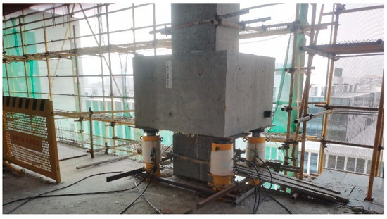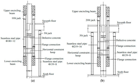 Two encircling beams were set up at the upper and lower positions of the defective column, in which the defective concrete needed to be reinforced. Seamless steel pipes and jacks were then installed between the upper and lower encircling beams, as seen in Figure 2. It can be seen that the jacks are located on the seamless steel pipe, in which the upper load can be transferred to the lower concrete column without passing through the defective columns. The reinforcement steel used in this project was primarily HRB400, a common hot-rolled ribbed rebar (China New Steel Group Co., Ltd., Xuzhou, China) in China with a nominal yield strength of 400 MPa that is suitable for load-bearing structural elements. The welding rods employed were E5016, a low-hydrogen electrode with a tensile strength of ≥500 MPa that is known for its good crack resistance and weldability. For the replacement steel supports between the encircling beams, seamless steel pipes with specifications of Φ180 × 12 and Φ219 × 16 were utilized, as shown in Table 1. Additionally, a seamless steel pipe with a diameter of Φ159 × 8 was used to support the beam end of each floor, which can be seen clearly in Figure 2. The choice of these diameters and wall thicknesses ensured a sufficient axial bearing capacity while maintaining a manageable installation weight. Notably, the grouting material used in this project has a strength grade of C30 and all structural adhesives used were A grade unless otherwise specified.