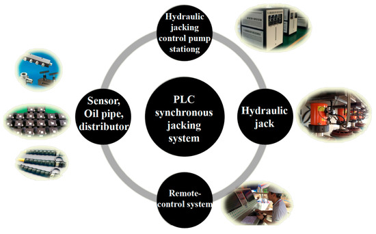 The PLC synchronous jacking system consists of a hydraulic jacking control pump station, sensor, oil pipe, distributor, a remote-control system, and hydraulic jacks, As shown in Figure 4. This system enables the precise lifting and positioning of a large-scale, heavy or complex structure by dynamically adjusting it based on feedback from displacement and pressure sensors, which is applicable to structural components with any weight distribution. The synchronous jacking process mitigates bending, twisting, or tilting effects caused by uneven weight distribution or load variations among different jacking points. A single PLC continuously monitors the displacement and load at each jacking point, and adjusts the hydraulic flow accordingly to ensure high-precision position control. This automated control system eliminates the need for manual intervention when load displacement deviations occur; thus, the efficiency and safety of the jacking operation are improved.
