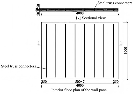 The sandwich wall panel uses connectors passing through the middle insulation layer to connect the inner and outer concrete slabs into a unified three-layer structure [17]. Connectors play a critical role in ensuring reliable connections between the inner and outer sides of the sandwich wall panel. Distributed in a truss-type configuration within the wall panel, connectors ensure coordinated force application between the inner and outer slabs, thereby achieving a combined effect [18]. Greater connector stiffness enhances the integration of the wall panel. Therefore, this study selects stainless steel truss connectors, which effectively distribute and balance structural loads through the coordinated action of chords and webs, ensuring the combined effect and overall stability of the sandwich wall panel. The stainless steel connector system has been extensively applied in Europe [19,20].