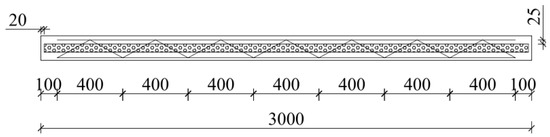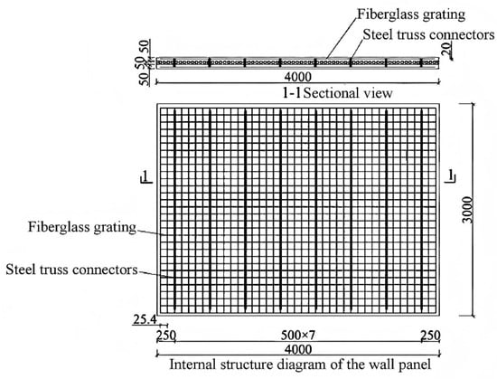 The internal structure of the PFRC sandwich wall panel is illustrated in Figure 1. Its dimensions are designed as 4000 mm × 3000 mm × 150 mm, based on the overall panel size. Specifically, the panel width is 4000 mm, the height is 3000 mm, and the thickness of both the inner and outer concrete slabs is 50 mm. The insulation layer consists of a 50 mm thick XPS (extruded polystyrene foam) board, leading to a total thickness of 150 mm. The distance between the steel truss connector and the edge of the wall panel is 250 mm, with an arrangement spacing of 500 mm between adjacent steel trusses. Figure 2 provides a detailed view of the steel truss connector, which measures 2800 mm in length and comprises seven bands, each 400 mm long. The anchoring depth is set at 25 mm. Additionally, 20 mm thick concrete edge sealing is applied at both ends of the wall panel’s height to protect the insulation layer. The internal layouts of G-PFRC and G-UC sandwich wall panels are depicted in Figure 3. The dimension of the glass fiber grid is 3900 mm × 2900 mm, with a single mesh size of 25.4 mm × 25.4 mm. The embedding depth from the inner and outer surfaces of the concrete slab is 20 mm. Apart from the glass fiber grid, all wall panels share identical dimensions and internal structures. The three-dimensional schematic diagram of sandwich wall panels in Figure 4 visually demonstrates its internal structure.