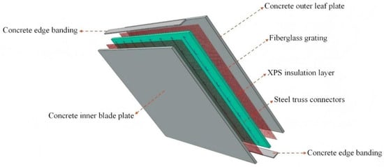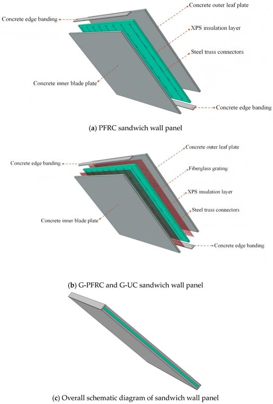 The prefabricated concrete composite sandwich wall panel represents a new type of energy-saving wall panel that combines assembly construction with low energy consumption, which conforms to the “green and low-carbon” concept and holds broad application prospects in the field of prefabricated buildings [1,2]. The inner and outer concrete slabs on both sides of traditional sandwich wall panels are typically made of ordinary concrete materials, which exhibit deficiencies such as low tensile strength, susceptibility to cracking, and high brittleness [3,4]. To improve ductility, steel mesh is usually incorporated into traditional concrete sandwich wall panels. However, this practice involves cumbersome manual binding and installation positioning [5], increasing labor costs and construction time for non-load-bearing sandwich wall panels used in enclosure structures. To reduce labor costs and enhance construction efficiency, this study considers the reinforcing influence of polypropylene fiber on the mechanical properties and deformation capacity of concrete, along with its advantages of light weight, corrosion resistance, and low cost [6,7,8]. Polypropylene fiber concrete is introduced into prefabricated composite sandwich wall panels, replacing steel mesh to ensure the ductility of the wall panel.