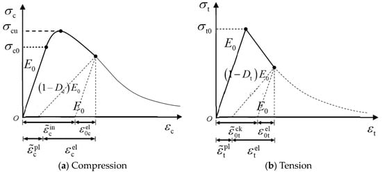 ABAQUS2022 offers users three constitutive models for describing the mechanical behavior of concrete: the Model of Concrete Damage Plasticity (CDP), the Model of Concrete Smeared Cracking (CSC), and the Model of Concrete Brittle Cracking (CBC) [21,22,23,24]. By defining parameters such as Poisson’s ratio, elastic modulus, yield stress, inelastic strain, and softening parameter, the CDP model can comprehensively capture the stress–strain curve, encompassing the elastic, plastic, softening, and failure stages. The CDP model overcomes the limitations of the CSC model, which only simulates macroscopic cracks through stiffness reduction, and the CBC model, which is only applicable to ideal brittle fracture while ignoring plastic deformation. It achieves this by independently defining tensile damage and compressive damage variables to, respectively, describe the propagation of concrete micro-cracks and crushing behavior. The CDP model can better simulate the absorption of external energy and its conversion to internal energy through material plastic deformation, quantitatively reflect stiffness degradation through damage variables, and simulate the process of structural transition from elastic to failure states. Consequently, the CDP model was chosen to explain the constitutive relationship of concrete.