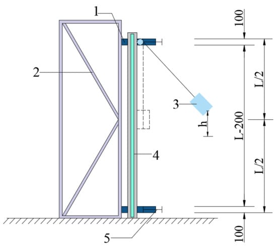 Impact device diagram. Note: Explanation of the numbers in the schematic diagram of the impact device: 1-fixed beam (support); 2-fixed frame; 3-impact object; 4-wall panel specimen; and 5-beam fastening device.