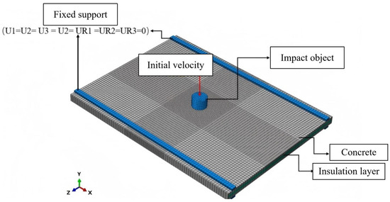 According to the wall panel impact performance test device described in the “Test Methods for Building Wallboard” (GB/T 30100-2013) [36], the boundary conditions of the wall panel are defined as shown in Figure 8. Although some current studies simulate the interaction and slip between dissimilar materials by setting relevant parameters [37], the strength of the insulation layer material involved in this paper is too weak compared to fiber-reinforced concrete. Therefore, this paper made relevant simplifications in the simulation, conducting the simulation analysis of the wall panel under relatively ideal conditions. The bond-slip effect between the insulation layer and the inner and outer concrete slabs is not considered, and the “Tie” command is used for binding. The steel truss and glass fiber grid are embedded throughout the entire wall panel model using the “Embed” command. The interaction between the support and wall panel, as well as between the impact object and the impact surface of the wall panel, is defined through surface contact. Specifically, the tangential behavior is governed by the penalty friction coefficient, while the normal behavior is defined as “hard contact”. To simplify the analysis, the impact object is treated as a rigid body, and its deformation effects are not considered. Additionally, the stress and strain induced in the support due to the transmitted impact force from the wall are negligible and can be disregarded. Therefore, the support is also modeled as a rigid body and fully constrained, with all translational and rotational degrees of freedom set to zero (i.e., U1 = U2 = U3 = UR1 = UR2 = UR3 = 0). The finite element model of the impact performance of the wall panel is demonstrated in Figure 9. The load is applied by specifying the impact object mass and assigning an initial velocity toward the wall in the initial analysis step of the predefined field. In the baseline model, the object has a mass of 120 kg and an original velocity of 6.26 m/s, which is equal to falling from a height of 2 m.