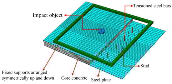 To validate the accuracy of the finite element model of the wall panel established in this study, the modeling method described above was employed to simulate the drop hammer impact test reported in the literature [38]. The specimen dimension is 1000 mm × 800 mm, with 2.9 mm thick steel plates installed at the top and bottom. Inside the steel plates, studs with a diameter of 5 mm and a length of 30 mm are welded at a spacing of 75 mm. The steel plates on both sides are connected by tension steel bars with a diameter of 10 mm and a spacing of 150 mm. A core concrete layer with a thickness of 75 mm is put between the steel plates. Fixed supports are arranged at the top and bottom of the wall panel to secure it in place. The impact object is a hemispherical rigid body with a diameter of 80 mm and a weight of 233.5 kg. Shell elements were used for the steel plates and stiffeners, solid elements for the concrete and drop hammer, and beam elements for the internal tie bars and studs. The mesh size was consistent with that in the literature. The dynamic friction coefficient between steel and concrete was supplemented as 0.1. Meanwhile, the material properties of concrete and steel were set using the constitutive models from the literature. The same Explicit module used in this paper was employed to simulate the dynamic response of the specimen under impact loading. The full-scale finite element model of the wall panel is demonstrated in Figure 10.