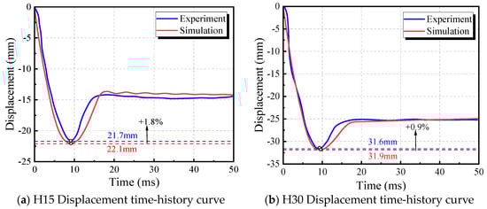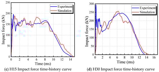 Numerical simulations were performed on two specimens, numbered H15 and H30 in the literature [38]. For H15, the drop height was 1.5 m, resulting in a collision speed of 5.42 m/s at the critical position. For H30, the drop height was 3 m, leading to a collision speed of 7.67 m/s at the critical position. The displacement time-history curve and impact force time-history curve of the wall panel were extracted and compared with the test results reported in the literature [38], as shown in Figure 11. The results demonstrate that the finite element model established in this study accurately simulates the mechanical behavior of the wall panel under impact loads. The finite element modeling method used herein exhibits good accuracy and reliability, making it suitable for impact finite element analysis of the wall panel.