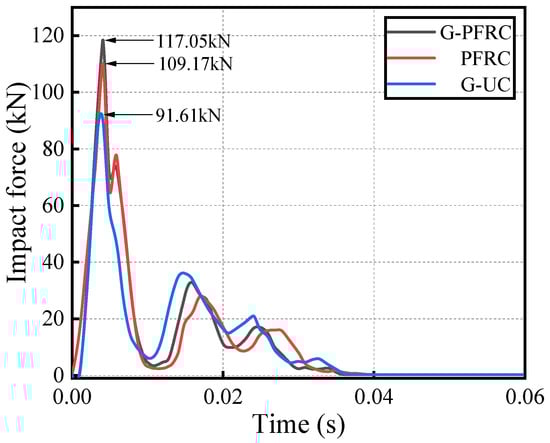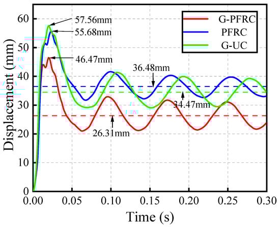 The wall panel finite element model established above serves as the benchmark model for impact finite element simulation. The displacement time-history curve, impact force time-history curve, and damage distribution curve of the PFRC sandwich wall panel, G-PFRC sandwich wall panel, and G-UC sandwich wall panel (used as the control group) were analyzed.