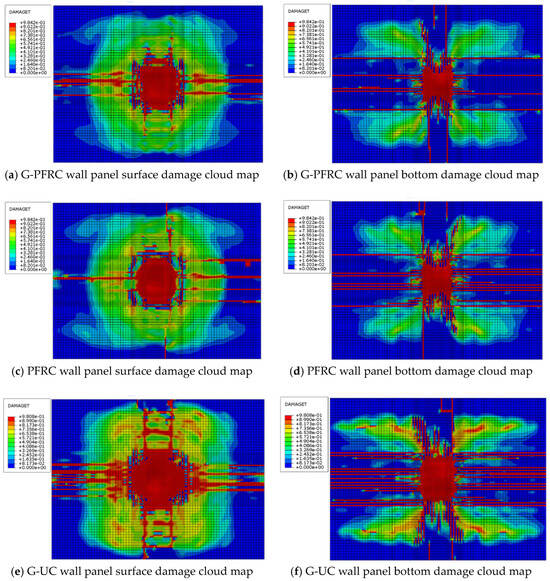 The damage cloud map of the wall panel reflects its crack development under impact loads. The damage cloud maps of all three wall panels were extracted for analysis, as shown in Figure 14. By observing the damage cloud maps, it can be found that all three panels share a common feature: the centers of both the surface and bottom of the wall panel are the most severely damaged areas, with an obvious local depression occurring at the impact position. The damage on the wall panel surface spreads in a ring shape around the impact point, while the bottom exhibits radial damage. Meanwhile, the boundary conditions of the wall panel and its weak stiffness at the mid-span position make the wall panel prone to overall bending deformation around the weak axis, thus generating more transverse damage cracks. Because of the remarkable mechanical properties of polypropylene fiber concrete, the overall deformation and local deformation of the G-PFRC sandwich wall panel are smaller than those of the G-UC sandwich wall panel. The damage of the G-UC sandwich wall panel is significantly more severe than that of the G-PFRC sandwich wall panel, resulting in a large number of transverse cracks. Additionally, it can be observed that the number of cracks in the G-PFRC sandwich wall panel is less than that in the PFRC sandwich wall panel, because the incorporation of glass fiber grids reduces the overall deformation of the G-PFRC sandwich wall panel. However, the local deformation range and damage degree at the center of both wall panels do not change significantly due to the incorporation of glass fiber grids.