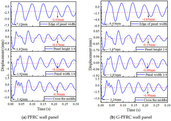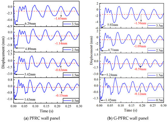 The displacement time-history curves of both of the two wall panels located at the mid-span are presented in Figure 25. It is evident that the deformation of the wall panel varies depending on the impact position. Specifically, when impacted at the edge, relatively large peak deformation and residual deformation occur, along with a larger vibration amplitude, indicating weaker impact resistance at the edge of the wall panel. When impacted at one-quarter of the wall panel height, the deformation of the wall panel is constrained by the support due to its proximity, resulting in minimal deformation at this position. After being impacted at one-quarter of the wall panel width, the impact response of the wall panel resembles that observed under mid-span conditions, with little difference in peak deformation.