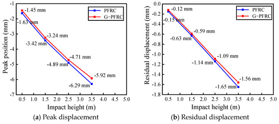 The mid-span displacement time-history curves of the PFRC and G-PFRC sandwich wall panels under different impact heights are presented in Figure 15. It can be found that as the impact height increases, the peak deformation and residual deformation of both wall panels after impact loads gradually increase. However, due to the incorporation of glass fiber grids in the G-PFRC sandwich wall panel, its peak deformation and residual deformation are smaller, though the difference between the two types of panels is not significant. This is because, despite the enhancement in impact energy with increasing impact height, the relatively smaller impact object mass does not cause substantial deformation of the wall panel. This also demonstrates that the incorporation of glass fiber grids enhances the wall panel’s resistance to impact deformation. The trend of peak deformation and residual deformation of the wall panel with respect to impact height is illustrated in Figure 16. It can be seen from the figure that with the increase in impact height, the peak deformation and residual deformation of the wall panel increase approximately linearly.