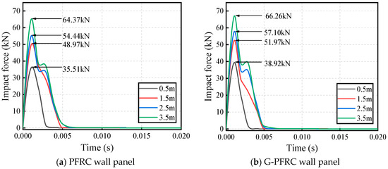 The impact force time-history curves of the PFRC and G-PFRC sandwich wall panels are depicted in Figure 17. From the figure, it can be seen that as the impact height increases, the impact force on the wall panel gradually increases. The impact force on the G-PFRC sandwich wall panel is greater than that on the PFRC sandwich wall panel. The reason is that the incorporation of glass fiber grids reduces the deformation of the wall panel to a certain extent and strengthens the interaction between the wall panel and the impact object [41].