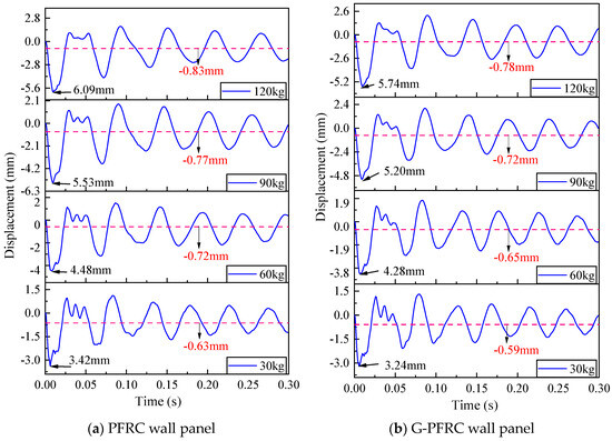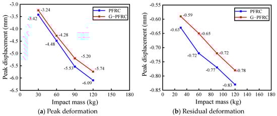 The displacement time-history curves of the PFRC and G-PFRC sandwich wall panels under different impact masses are presented in Figure 18, while the change curve of peak deformation and residual deformation of both wall panels with respect to impact mass is illustrated in Figure 19. By analyzing Figure 18 and Figure 19 together, it can be observed that as the impact object mass rises, both the peak deformation and residual deformation of the wall panel after impact also increase. Moreover, the displacement of the G-PFRC sandwich wall panel is smaller than that of the PFRC sandwich wall panel, further demonstrating the reinforcing effect of glass fiber grids on the impact resistance of the wall panel.