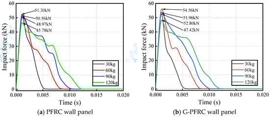 The impact force time-history curves of the PFRC and G-PFRC sandwich wall panels under different impact masses are shown in Figure 20. By observing Figure 20, it is found that the variation in the impact force of the wall panel differs from the change in impact force under varying impact heights mentioned earlier. As the impact object mass rises, the interaction time between the impact object and the wall panel gradually lengthens, and the impact force on both wall panels initially rises and then decreases. This indicates that the magnitude of impact force on the wall panel at this point is not determined by a single factor but requires consideration of the combined effects of factors such as the mass, velocity, and contact time of the impact object with the wall panel.