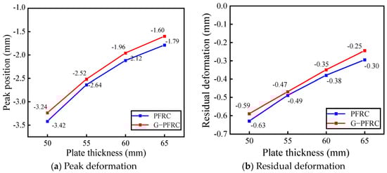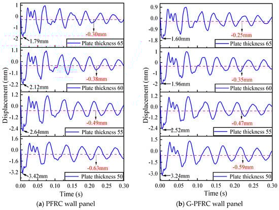 To analyze the effect of varying thicknesses of inner and outer concrete slabs on the impact performance of the wall panel, the slab thickness Ct was increased to 55 mm, 60 mm, and 65 mm to establish a new wall panel finite element model for analysis. The displacement time-history curves of the G-PFRC and PFRC sandwich wall panels are shown in Figure 21. The figure demonstrates that the displacement time-history curves of the wall panel with varying thicknesses of inner and outer concrete slabs are similar. Figure 22 reflects the changes in the peak deformation and residual deformation of the wall panel under different concrete slab thicknesses. Since the increase in slab thickness enhances the overall stiffness of the wall panel, it can be found from the figure that the deformation of the wall panel during the impact process is reduced, thereby decreasing the peak deformation and residual deformation of the wall panel. From the beginning to the end, the peak deformation and residual deformation of the G-PFRC sandwich wall panel are smaller than those of the PFRC sandwich wall panel, indicating that the deformation of the G-PFRC sandwich wall panel is less pronounced.