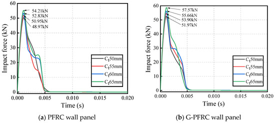 The impact force time-history curves of the PFRC and G-PFRC sandwich wall panels under different concrete slab thicknesses are presented in Figure 23. It can be found that the interaction time of the impact object and the wall panel does not change significantly with increasing slab thickness, but the impact force on the wall panel gradually increases with increasing slab thickness. This is because, as the stiffness of the wall panel increases, the wall panel becomes less prone to deformation. When the impact energy remains constant, the deformation energy of the wall panel decreases, and more energy is converted into reaction force, thus increasing the impact force.