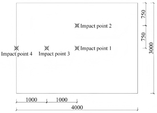 During the transportation and use of the wall panel, the impact position is random. Hence, it is required to analyze the impact effects of various impact positions on the wall panel. The four impact point positions considered in this study are shown in Figure 24, namely the mid-span of the wall panel (impact point 1), one-quarter of the panel height (impact point 2), one-quarter of the panel width (impact point 3), and the edge of the panel width (impact point 4).